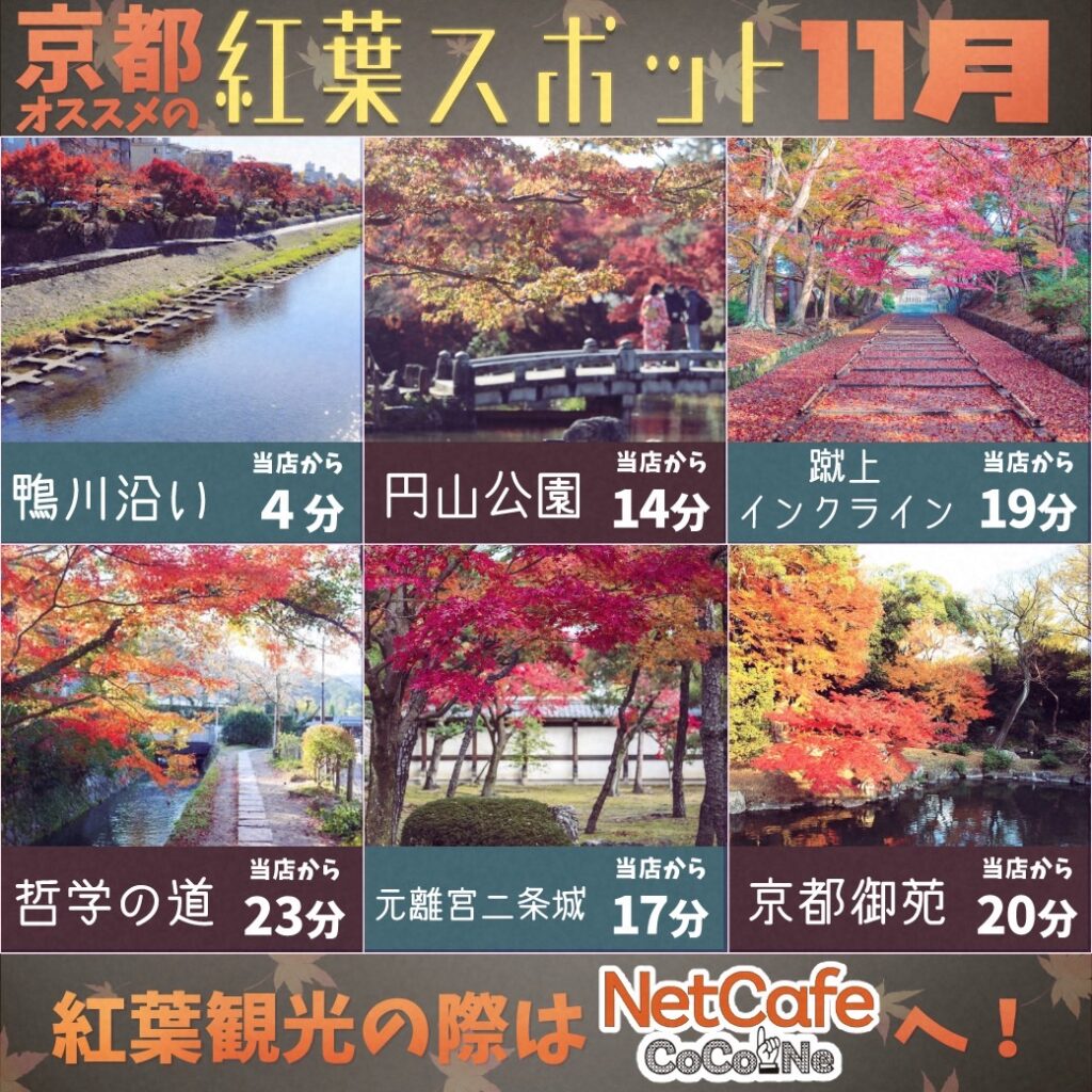少し足を延ばせば、蹴上インクラインや哲学の道、二条城、京都御苑などなど、秋を堪能できる名所が数多くございます。