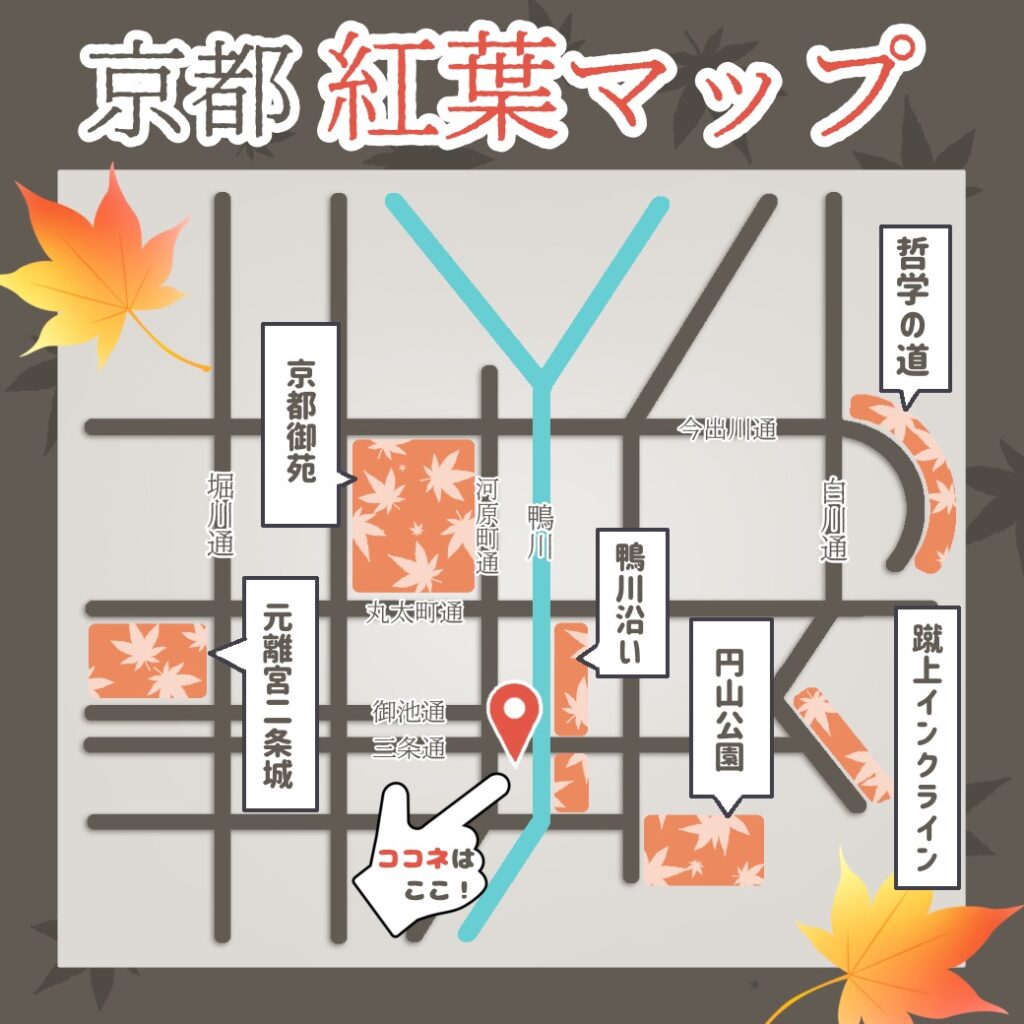 徒歩圏内には、鴨川沿いや円山公園など、気軽に立ち寄れる紅葉スポットがございます。