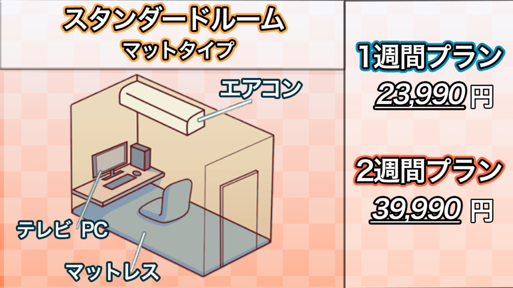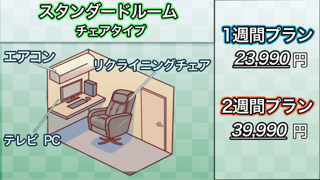 お一人様でご利用できるスタンダードルームはマットタイプとリクライニングチェアタイプがございます。