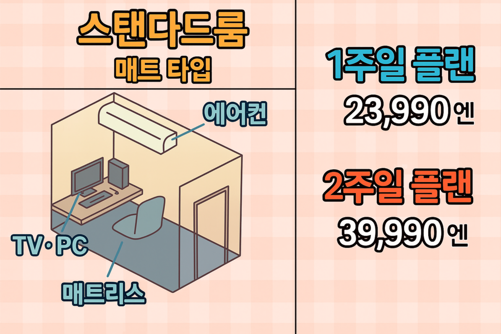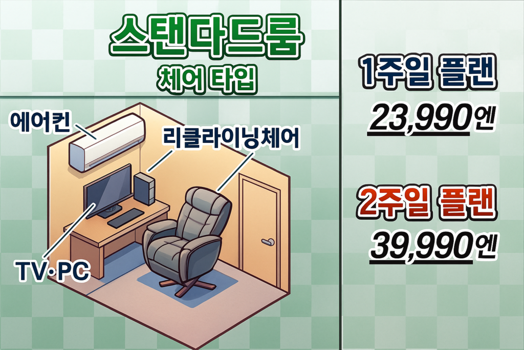 혼자서도 이용가능한 스탠다드룸은 메트타입과 리클라이닝타입이 준비되어 있습니다.