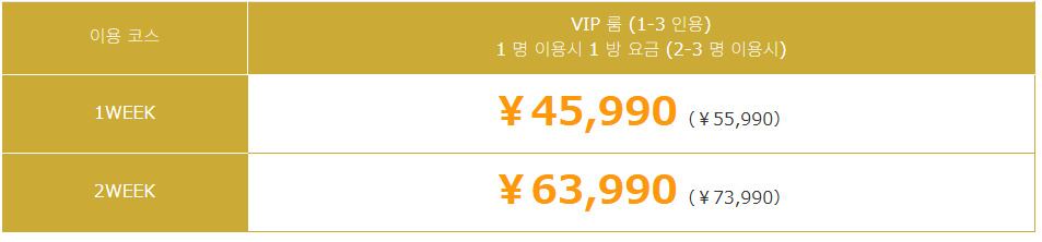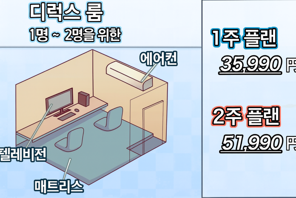 2명이 디럭스룸을 이용하실 경우, 1주 플랜은 45,990엔, 2주 플랜은 61,990엔입니다.